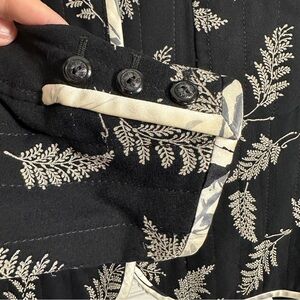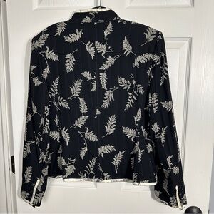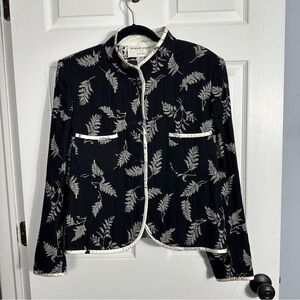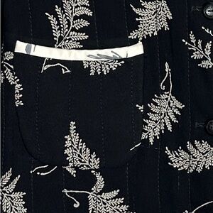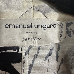 Vintage Emanuel Ungaro Paris Parallele jacket, 100% silk. Made in Italy. Size 37 (8-10), but please check measurements carefully to ensure fit. Black with white design of ferns, white trim, button and hook/eye front closure, front patch pockets. Two of the original buttons are missing from one cuff and have been replaced with plain buttons.