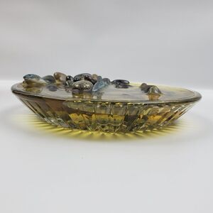 Clear Ribbed Glass Dish with Yellow Resin & Multi-color Real River Rock Stones & 3 Fish 1