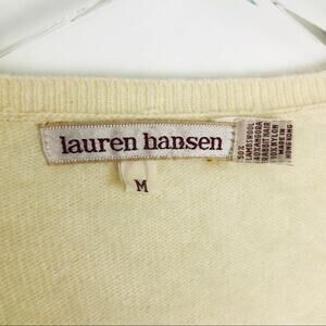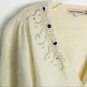 Lauren Hansen. Super, super soft wool and angora button front cardigan sweater. Dainty sequin and bead embellishments on the front with soft pleating at the shoulders. Small shoulder pads. Winter white. Size medium.