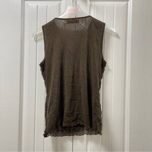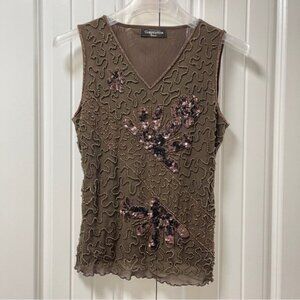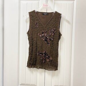 This vintage Temptation Italy sleeveless top is a whimsical nod to 90s fairy grunge fashion. Crafted from a stretchy, double-layered mesh fabric, it features a stunning beaded sequin flower design. The dark chocolate brown color and V-neck tank style exude charm and sophistication, making this a standout piece for any wardrobe.