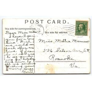 Postmarked in 1909 and printed in Germany, this original postcard bears a 1-cent green U.S. postage stamp and includes handwritten holiday wishes on the back, adding a personal and nostalgic touch. The intricate embossing and vintage design make it a delightful collectible for Christmas postcard enthusiasts and those who appreciate early holiday ephemera.