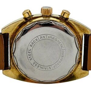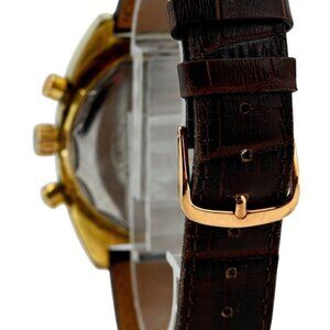Features: Original gold tone dial, smooth bezel, Swiss made mechanical movement, analog display, a chronograph, a date display, and an acrylic crystal