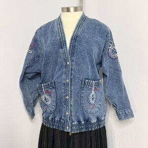 Vintage Embroidered Acid Denim Bomber Jacket Snap Front Large
