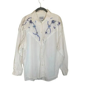 Vintage Embroidered Beaded Western Blouse Shirt Womens Size XL White Blue Button