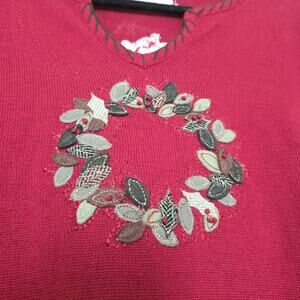 Vintage Embroidered Christmas Sweater Womens XL Red Wreath Holiday Cottage Boho