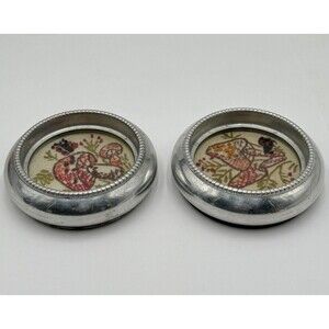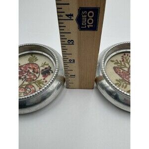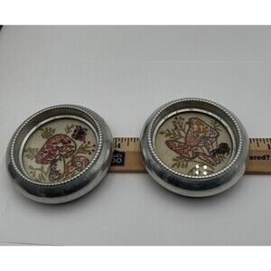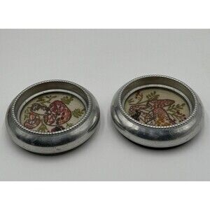 Vintage Embroidered Coasters Mushrooms Decorative Silver Tone Metal Set Of 2 HK