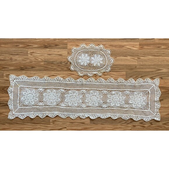 Vintage Embroidered Crocheted Table Runners And Matching Doily