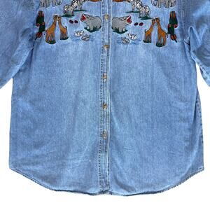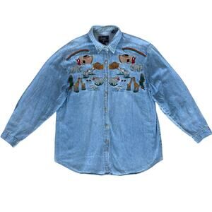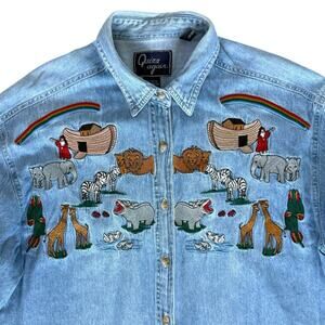 Vintage Embroidered Denim Button Front Shirt Cotton Noahs Ark Womens Size Large