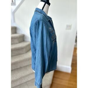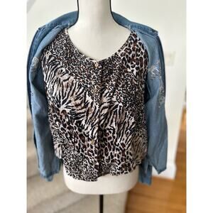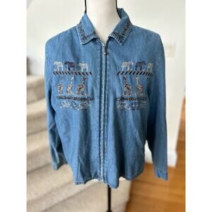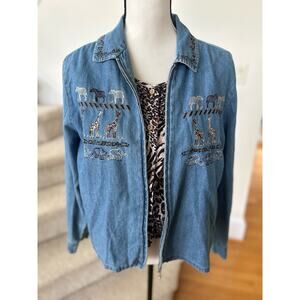 Very good condition, very faint yellowing on inner neck. Denim lightweight jacket with full zip front, and interior (not detachable) animal print (zebra/leopard/cheetah) vest. Outside chest features embroidered zebras, giraffes, and elephants.