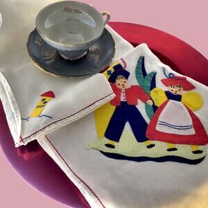 This beautiful 5-piece vintage linen set includes a hand-embroidered square card tablecloth (approx. 34"x34") and four matching napkins (10"x10.5" each), inspired by the classic Holland Dutch couple motif popular in the 1930s. The design features bright yellow, red, green, and blue threadwork, with lighthouses on the napkins.