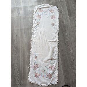 Vintage Embroidered Floral Leaf Table Runner With Crochet Lace Edging 20"x18"