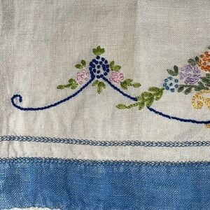 Vintage embroidered floral scalloped edge tea towel. Approximately 29 1/2” x 17”. Very good pre owned condition