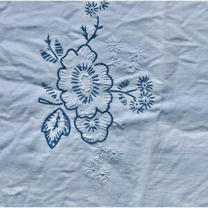 This table runner features intricate blue floral embroidery on white and hand-crocheted white and edges, lending a refined touch to home décor. Measures 18” x 42”.