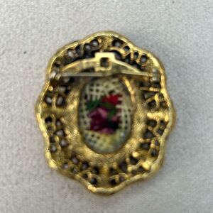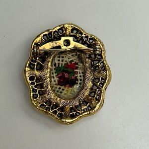 This vintage embroidered flower brooch features a stunning pink and green needlepoint floral design against a sleek black background. The intricate floral motif is set within a gold-tone oval frame with scalloped edges, adding a touch of elegance and charm. It is secured with a rollover clasp closure, making it a classic accessory that effortlessly enhances any outfit.