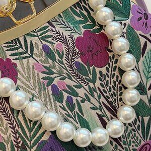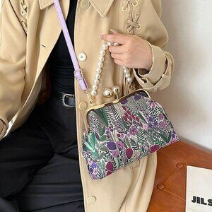 Features: This canvas crossbody purse features exquisite floral embroidery that adds a romantic touch to any look. It has a main compartment plus a zippered interior pocket, perfect for holding essentials like your wallet, phone, keys, glasses, and more. The classic design with a pearl chain detail exudes timeless elegance.