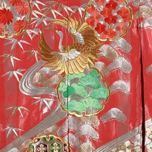 Metallic silk iridescent brocade of red and orange silk decorated with auspicious Japanese symbols and motifs associated with happy marriage, union, long life and children.