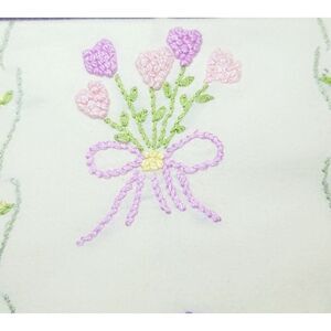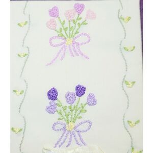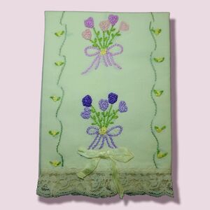Vintage Embroidered Kitchen Hand Towel Pink Purple Flower Bouquet Laced Boarder