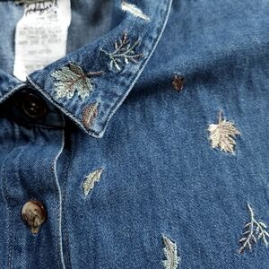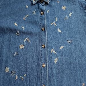 Vintage Embroidered Leaves Chambray Button Down Sz Medium. 100% cotton, embroidered falling leaves down the front. Light shoulder pads. Good used condition, don't see any holes or stains. Flat measurements approximately