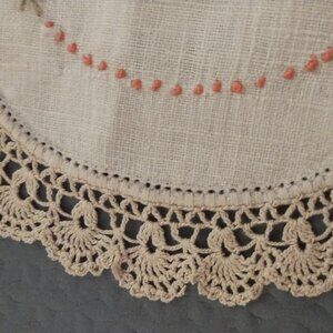Vintage Embroidered Linen Crocheted-Edge Doily Boho Shabby Chic