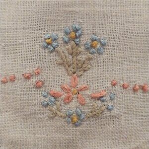 * Pretty hand-embroidered floral design in pastel pink, blue, yellow, and green.