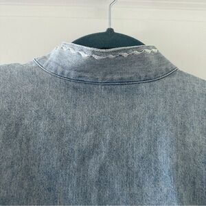 Vintage blue denim long sleeve button up shirt with white ribbon embroidery along the neckline, pockets, and cuffs. Features two chest pockets, shoulder pads, and a mock neck. Perfect for casual wear, relaxed fit. 100% cotton.