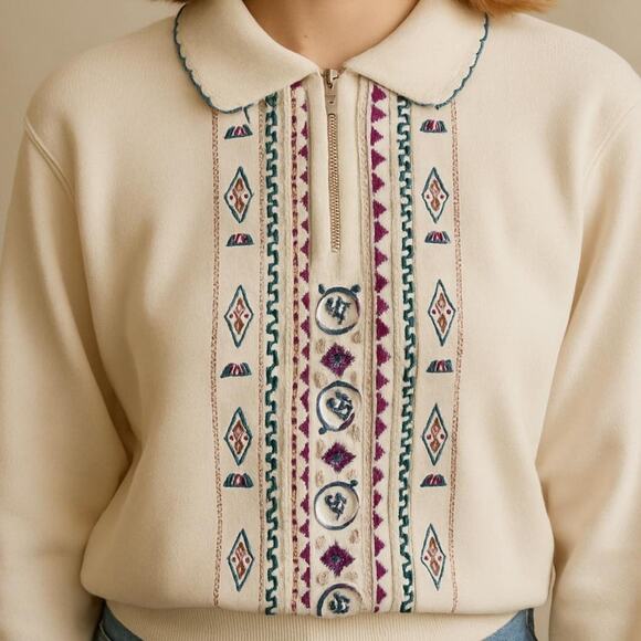 Beautiful vintage embroidered pullover sweatshirt in a women’s Medium. Features a scalloped collar, half-zip front, and intricate multicolor embroidered panel with floral and geometric detailing. Soft cream/ivory fabric gives it a cozy cottagecore, folk-inspired, grandma-core vibe.