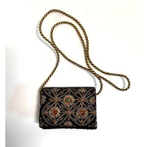 • Embroidered floral design on flap. Golden metallic embroidery with 2 amber and one sage/teal glass beads.
