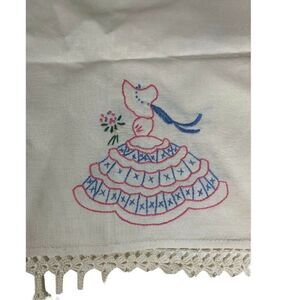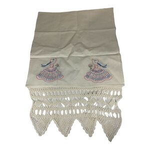 Vintage Embroidery Hand-quilted Sunbonnet Table Runner W Wide Heavy Lace Trim