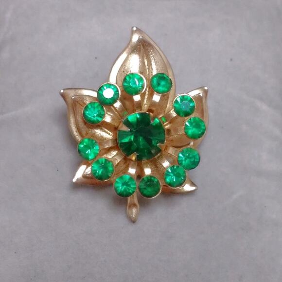 Vintage Emerald Green Brooch Mini Flower Pin Rhinestone Gold Tone Cut Out Leaf