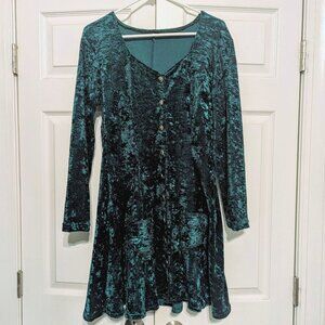 Absolutely amazing vintage long sleeved emerald / dark forest green crushed velvet fit & flare dress! There are no tags or size info, so please see photos for measurements! It does have good stretch as well. Button up with ornate gold toned buttons, and cute little pockets on the front of the dress skirt.