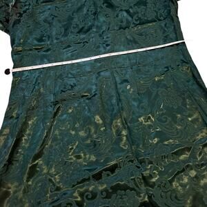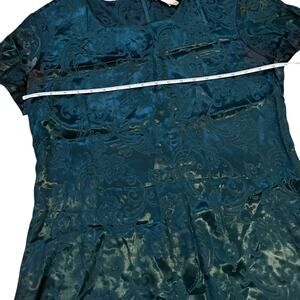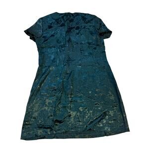 This stunning vintage dress features a rich teal green hue with an elegant floral jacquard brocade texture that gives it a luxurious, baroque-inspired look. With a flattering fit-and-flare silhouette, short sleeves, and a modest neckline, it offers timeless style perfect for holiday parties, evening events, or cocktail occasions. The shiny, structured fabric adds a touch of retro glam, making it a standout piece for anyone who loves classic, 90s formal fashion with a vintage twist.