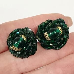 Vintage Emerald Green Glass Cluster Beaded Clip On Earrings