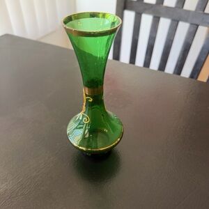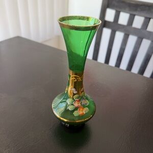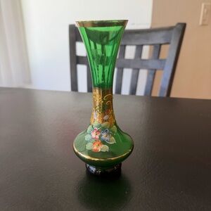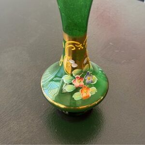 Vintage Emerald Green Glass Vase Gold Rim Hand Painted Flowers Czech Bohemian