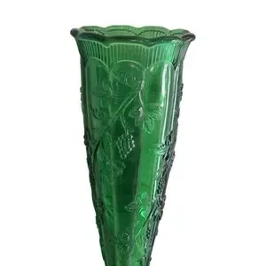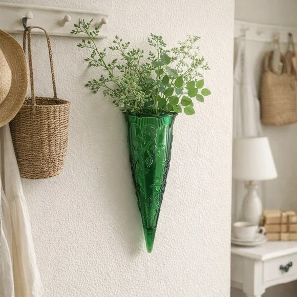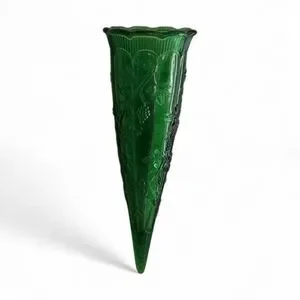 Add a touch of vintage charm to your space with this beautiful emerald green glass wall pocket vase featuring an embossed grape and vine pattern. The tapered cone shape and scalloped rim give it classic Depression-era character while the rich green color adds a pop of nostalgic cottagecore style. Perfect for displaying dried florals, eucalyptus stems, or seasonal greenery. A lovely piece for a vintage kitchen, entryway, gallery wall, or farmhouse décor display.