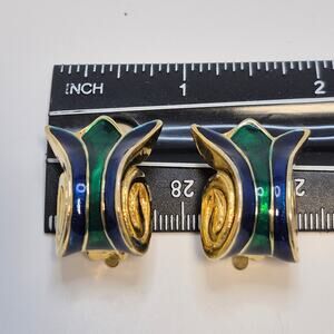 Vintage emerald green, royal blue, and gold-tone cloisonne enameled clip-on earrings.