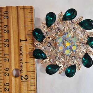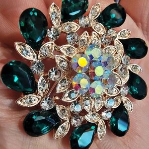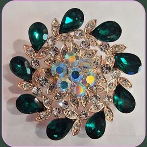 #Vintage #Emerald Marquis Clear AB Rhinestone Round Floral #Brooch Pin