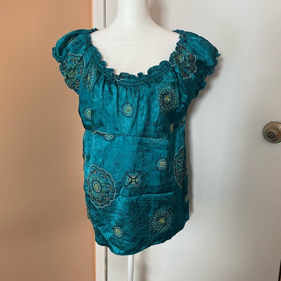 Chic teal blouse with detailed embroidery. Features ruffled sleeves and a gathered neckline. (SKU 023)