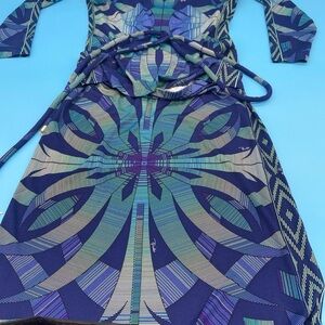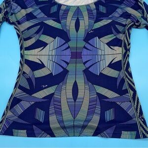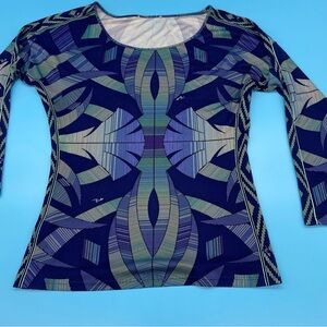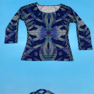 This set features a geometric, kaleidoscopic pattern in shades of blue, green, and purple. The sleeves are three-quarter length, and the neckline is a wide scoop. The print is mirrored down the center front, creating a symmetrical design. Based on the search results, similar vintage Set includes Top, Skirt and Accent Belt with Start Charm. Excellent Condition.