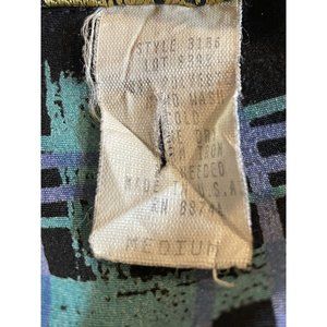 This vintage bomber jacket by Emily Adams is a statement piece for any occasion, from work to play. The abstract print in black, teal, and rust adds a pop of color to any outfit, while the button front and substantial polyester material provide comfort and durability. The jacket is a size medium and has a regular fit, perfect for adding a glam rock touch to your wardrobe. Elastic waist and cuffs with two side seam pockets. Its original and authentic 1980s style make it a truly unique piece that is sure to turn heads. No flaws.