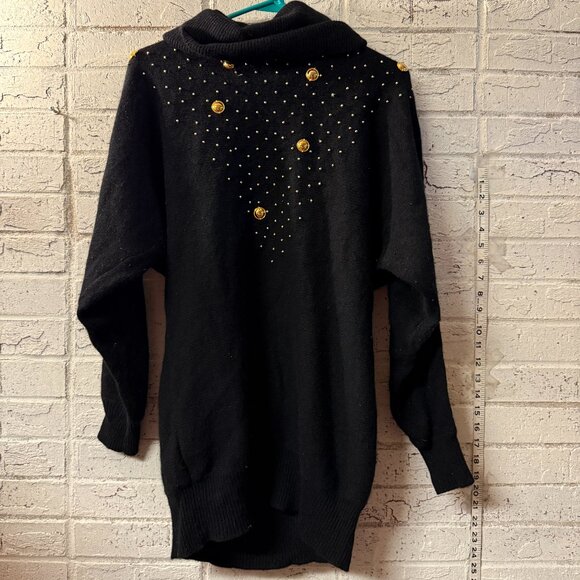 vintage angora sweater, 80s sweater dress, gold studded knit, glam rock sweater, black cowl neck tunic, Hong Kong knitwear, retro oversized sweater, vintage lambswool sweater, statement knit, embellished sweater, fall winter fashion, 80s glam aesthetic