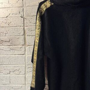 Step into glam vintage style with this Eminent cowl neck sweater tunic featuring gold-tone stud embellishments and statement crest buttons. Classic black knit with gold embroidered trim down the sleeves. Perfect as a sweater dress or oversized tunic paired with leggings or tights.