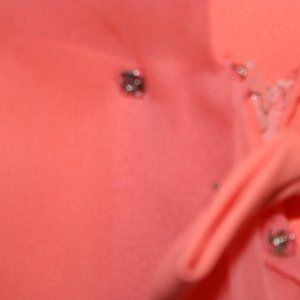 Vintage Emma Domb of California coral/tangerine trapeeze dress. Sheer overlay with bow covered snaps to close in back. Sz 9. flat measure shoulder to S: 16", Armpit to A: 17.5" W-16" L-36"