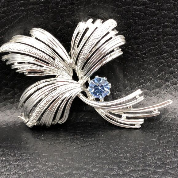 Vintage Emmons Brooch MAGNIFIQUE Abstract Leaf Blue Rhinestone Silver Tone 1960s