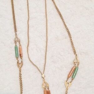 Add a touch of vintage elegance to your jewelry collection with this stunning signed Emmons double strand necklace. The necklace features beautiful green and orange Lucite beads, with a layered style that adds a pop of color to any outfit. The necklace is 22 inches in length and has a spring ring closure.