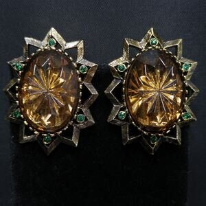Vintage Emmons Molded Topaz Glass Clip Earrings, Green Rhinestone Accents