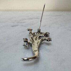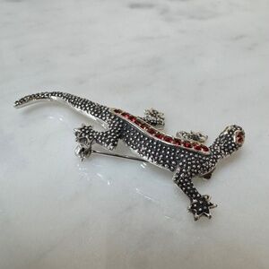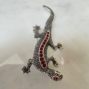 Pre-owned; in very good vintage condition. A vintage Emmons salamander lizard brooch pin with ruby red rhinestones mounted on silver-tone metal. No missing rhinestones. Clasp pin is in working condition. Shows minor signs of wear. This brooch measures 2.5"L x 1.1"W inch. Measurements are approximate. Sold 'AS-IS'. A complimentary of a jewelry box is included.