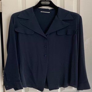 Soft and ladylike, this vintage navy Emporio banker's blouse has 3 buttons, 2 faux pockets and a pretty neckline. At 67% acetate and 33% silk it wears like silk but more durably. Made in Italy is was rarely worn and is in original condition. Size 46/10. Comes with original hangar.