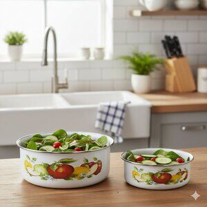 Infuse your kitchen with the timeless appeal of these vintage-inspired enamel bowls. The vibrant apple print pattern and durable enamel construction evoke the cozy, homespun feel of a bygone era, while the slight imperfection on the larger bowl adds genuine character.