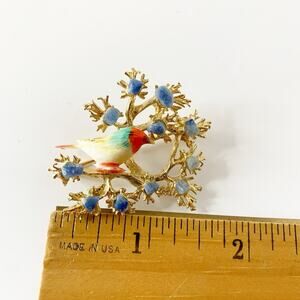 Vintage Enamel Bird On Branch Brooch Pin Gold Tone Blue Rhinestone Prong 1.75"