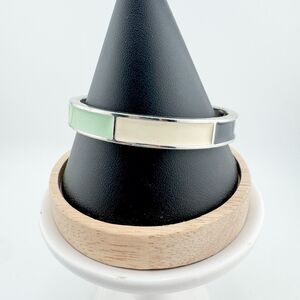 This vintage enamel block bracelet offers a chic, minimalist design with a retro twist. The hinged silver-tone bangle features sleek rectangular enamel panels in soft mint green, cream, and jet black a color-block palette straight out of the mod 1960s and Y2K revival trends. Its clean lines and glossy finish make it an easy accent for both office sophistication and casual weekend style. Stack it with other bangles for a modern geometric look or wear solo as a statement of understated elegance. vintage enamel bracelet, color block bangle, mod 1960s jewelry, minimalist hinged bracelet, geometric silver tone bracelet, Y2K color block style, retro enamel jewelry, vintage fashion accessory, sleek modern bracelet, timeless vintage chic.